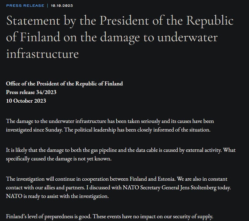 Fool me once shame on me, sabotage my pipeline twice, shame on… someone. A sudden loss of pressure in the pipeline between Finland and Estonia led to a quick investigation. Source for the official press release.